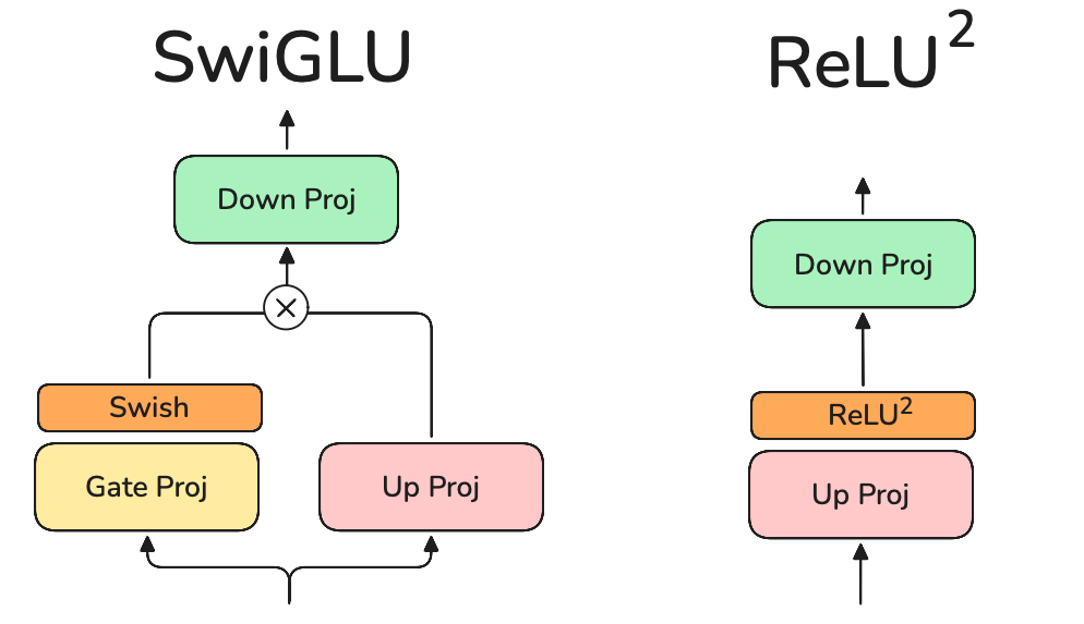 Llama3 uses SwiGLU which uses three linear layers while ReLU² uses only two. This should give us a boost in performance. However, while I like performance gains (and weight memory reduction), the FFN is supposedly where the model stores its knowledge and given my target domain, I am hesitant to bring this in.